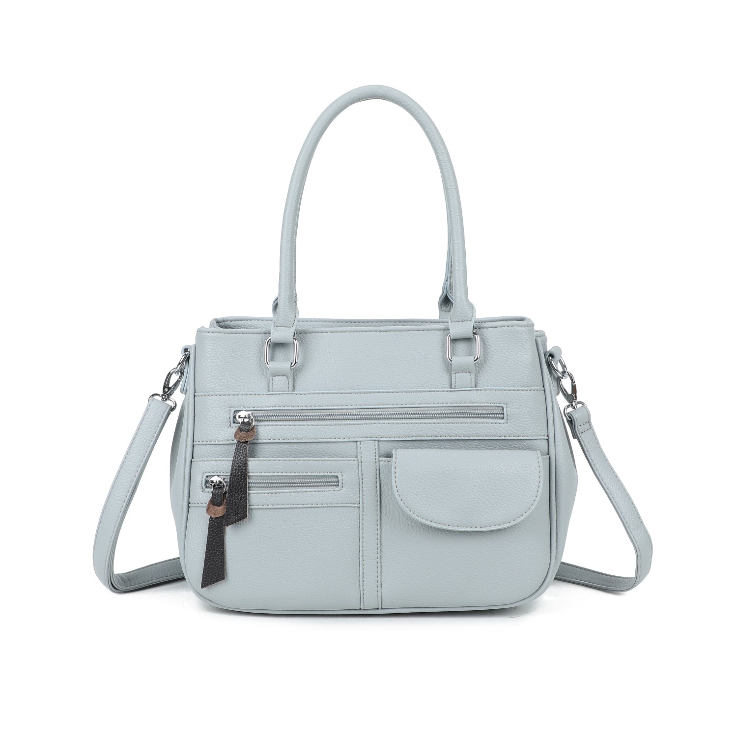 - Silver tone metal hardware with leather puller